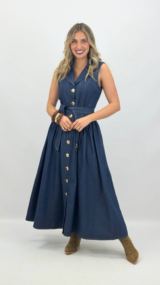 Midi φόρεμα denim με κουμπιά & ζώνη