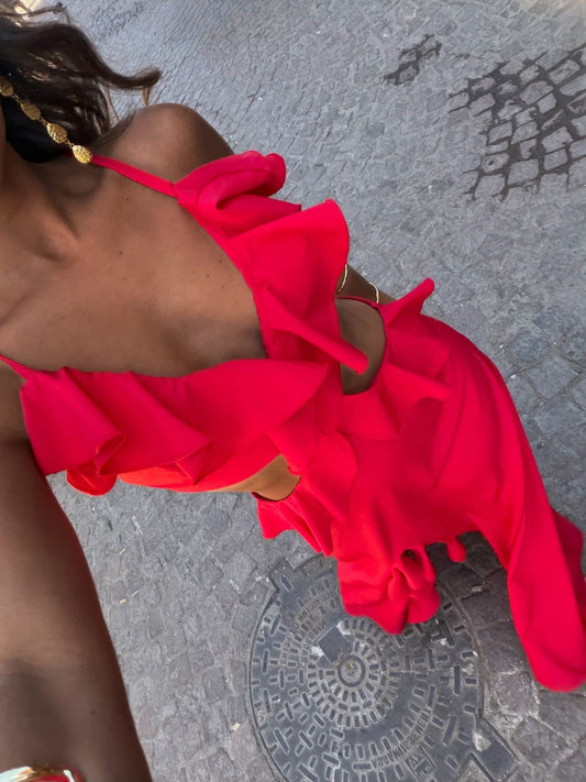 Maxi φόρεμα με βολάν & cut-out λεπτομέρειες