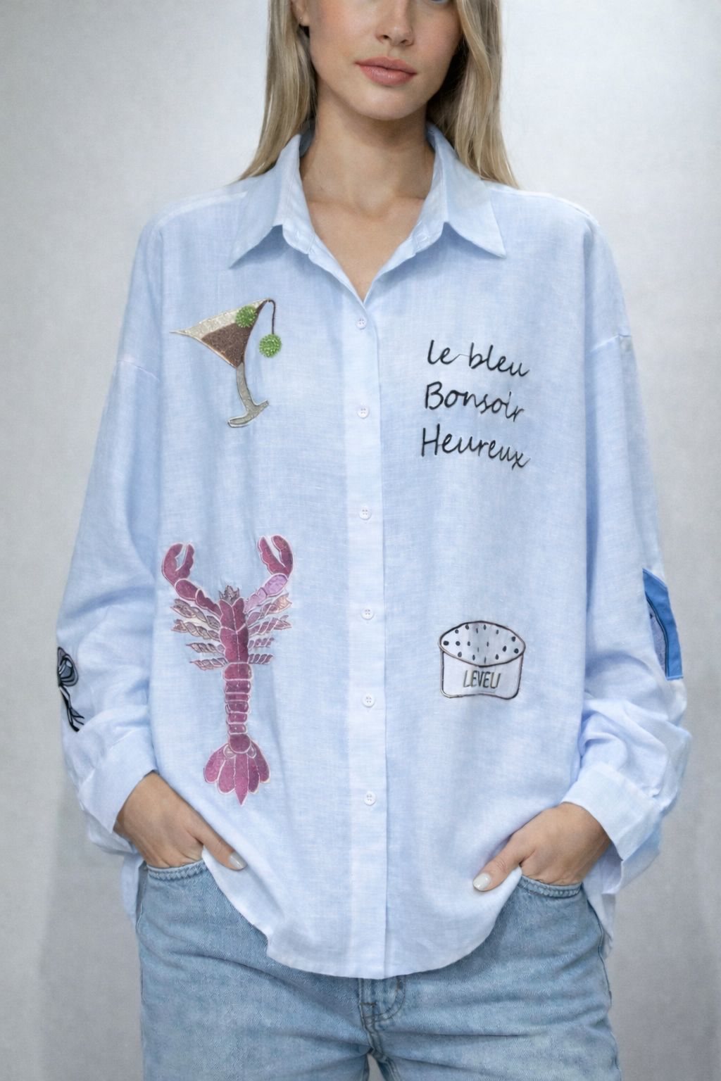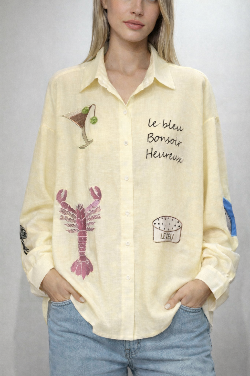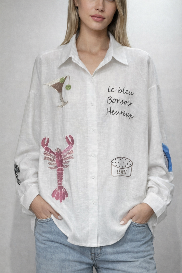 Μοντέρνο λευκό γυναικείο πουκάμισο με ιδιαίτερα σχέδια και κεντήματα, που χαρίζουν μοναδικό χαρακτήρα στο outfit. Διαθέτει κλασικό γιακά και κουμπιά μπροστά, ενώ η χαλαρή γραμμή του προσφέρει άνεση και stylish αποτέλεσμα.