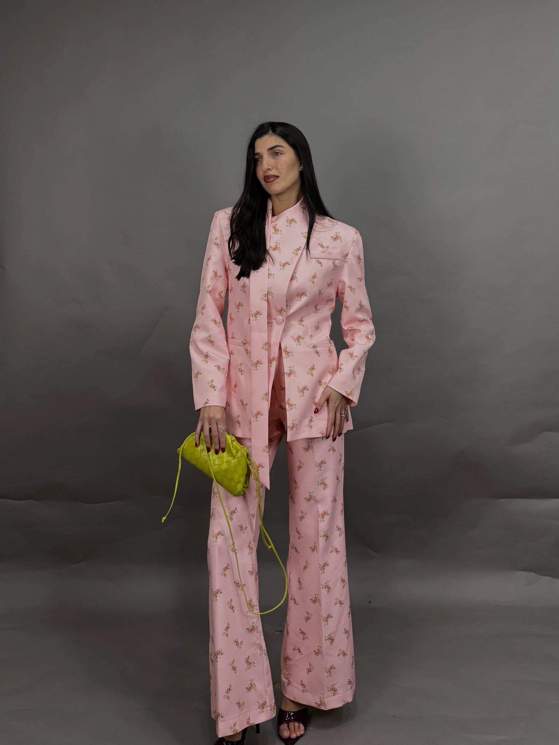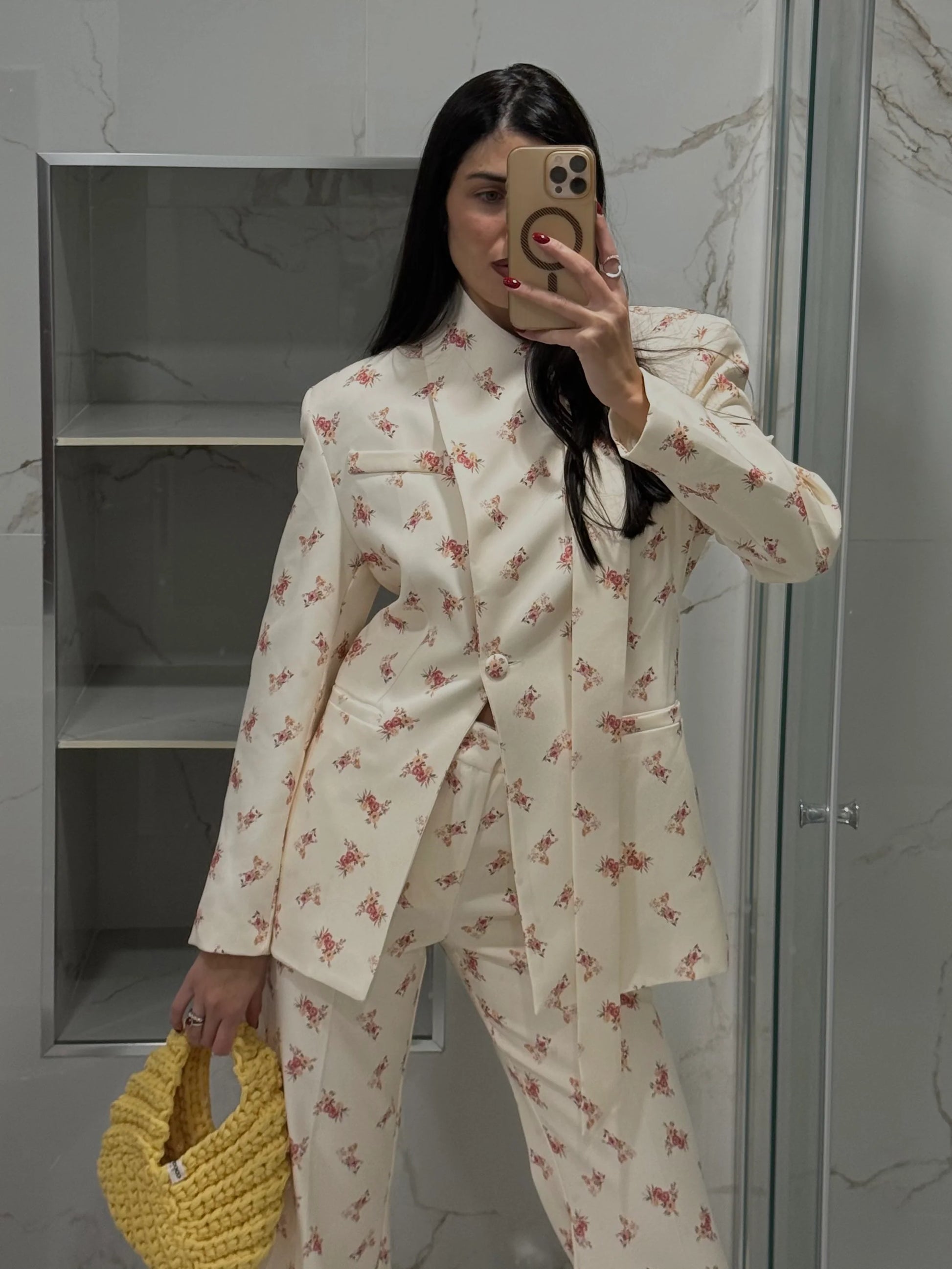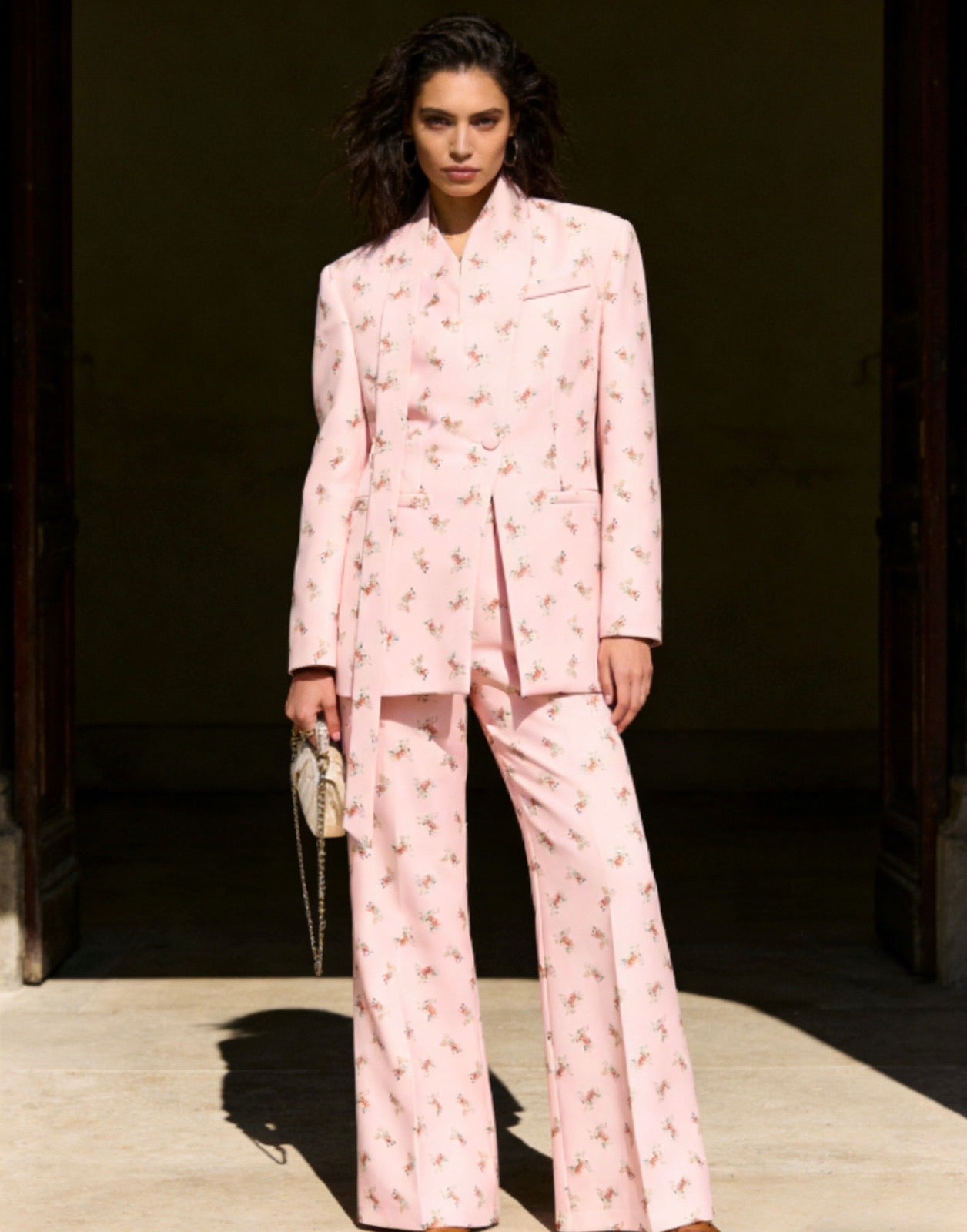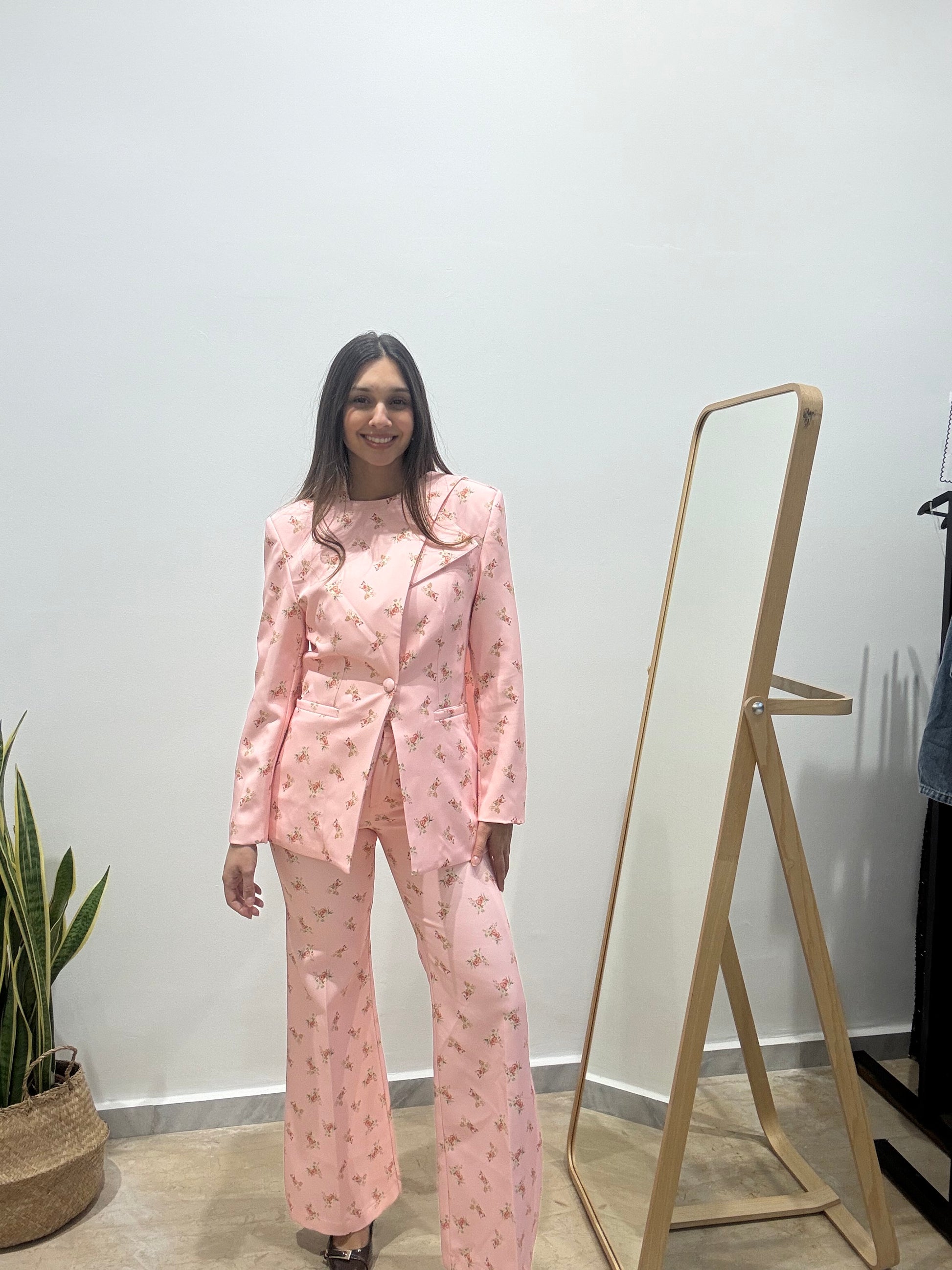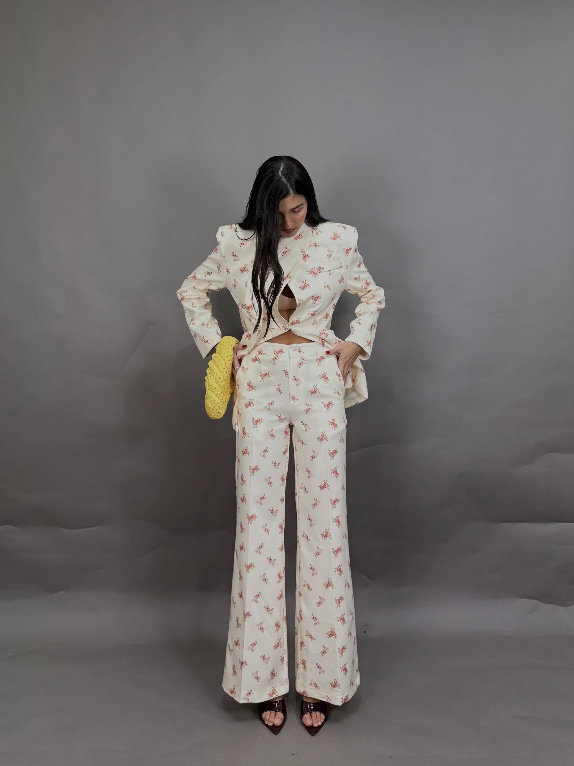 Ένα tailored σετ που ισορροπεί ανάμεσα στο ρομαντικό floral και τη δυναμική, δομημένη σιλουέτα.