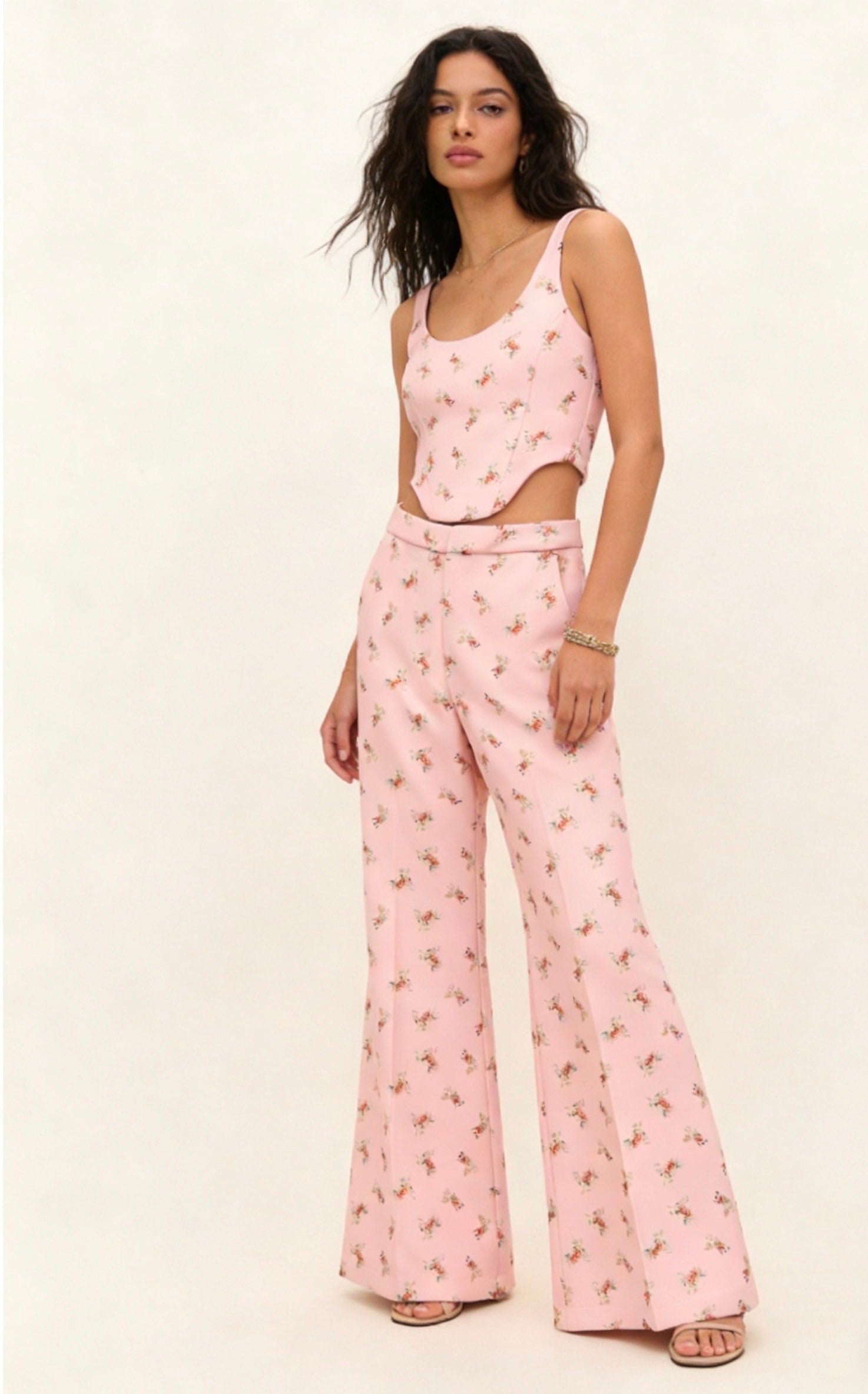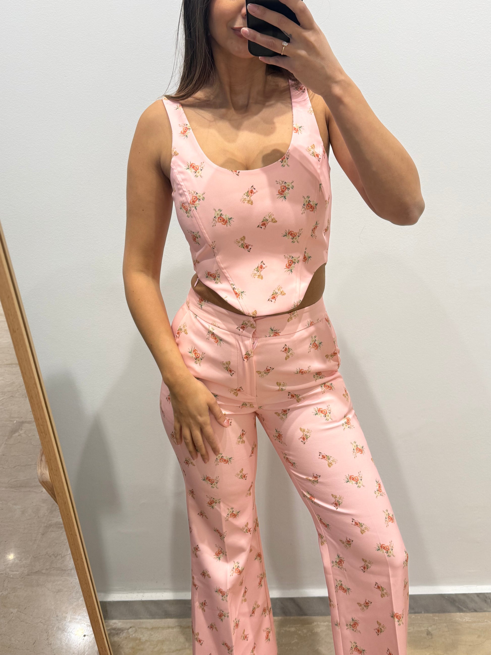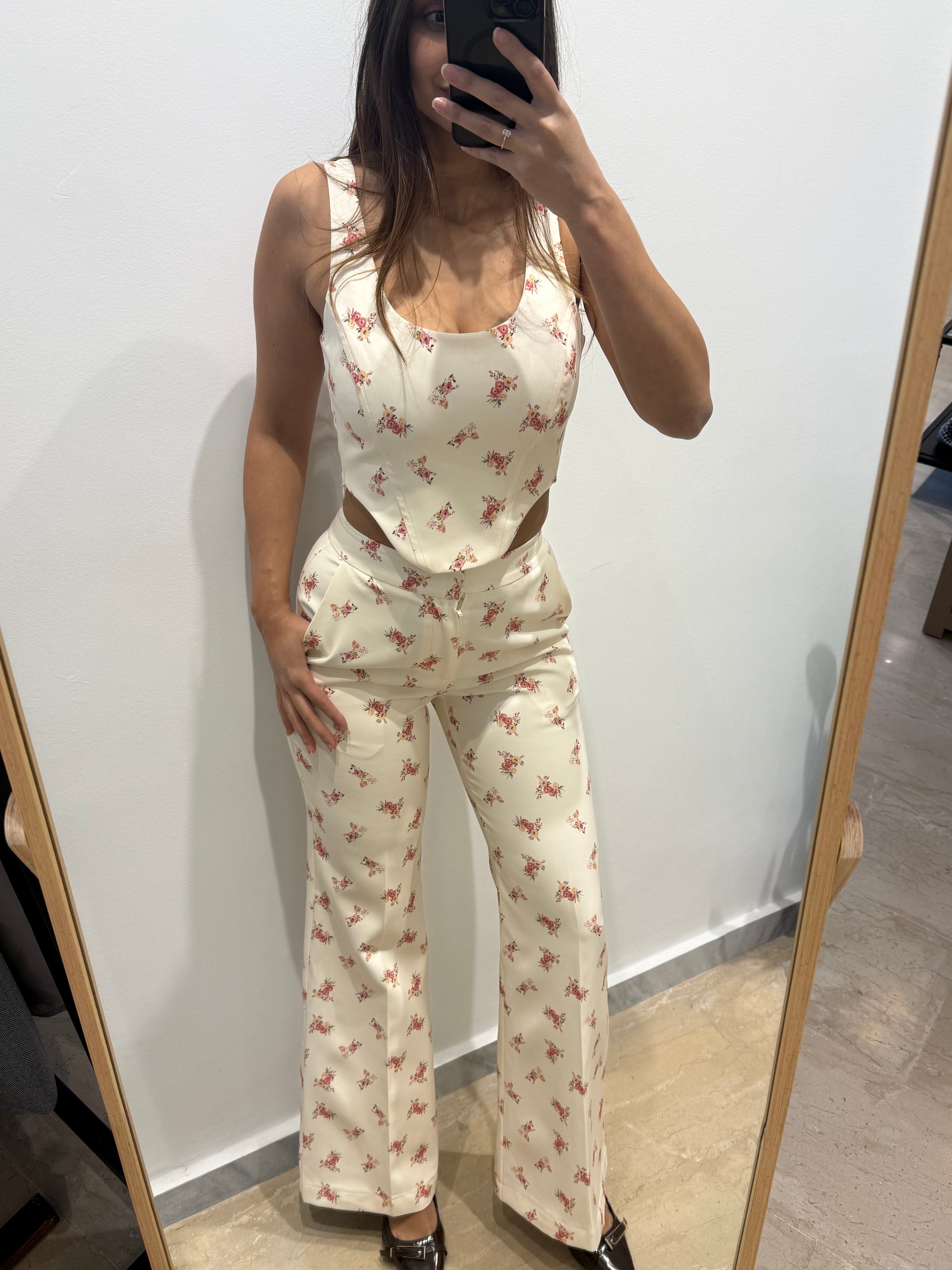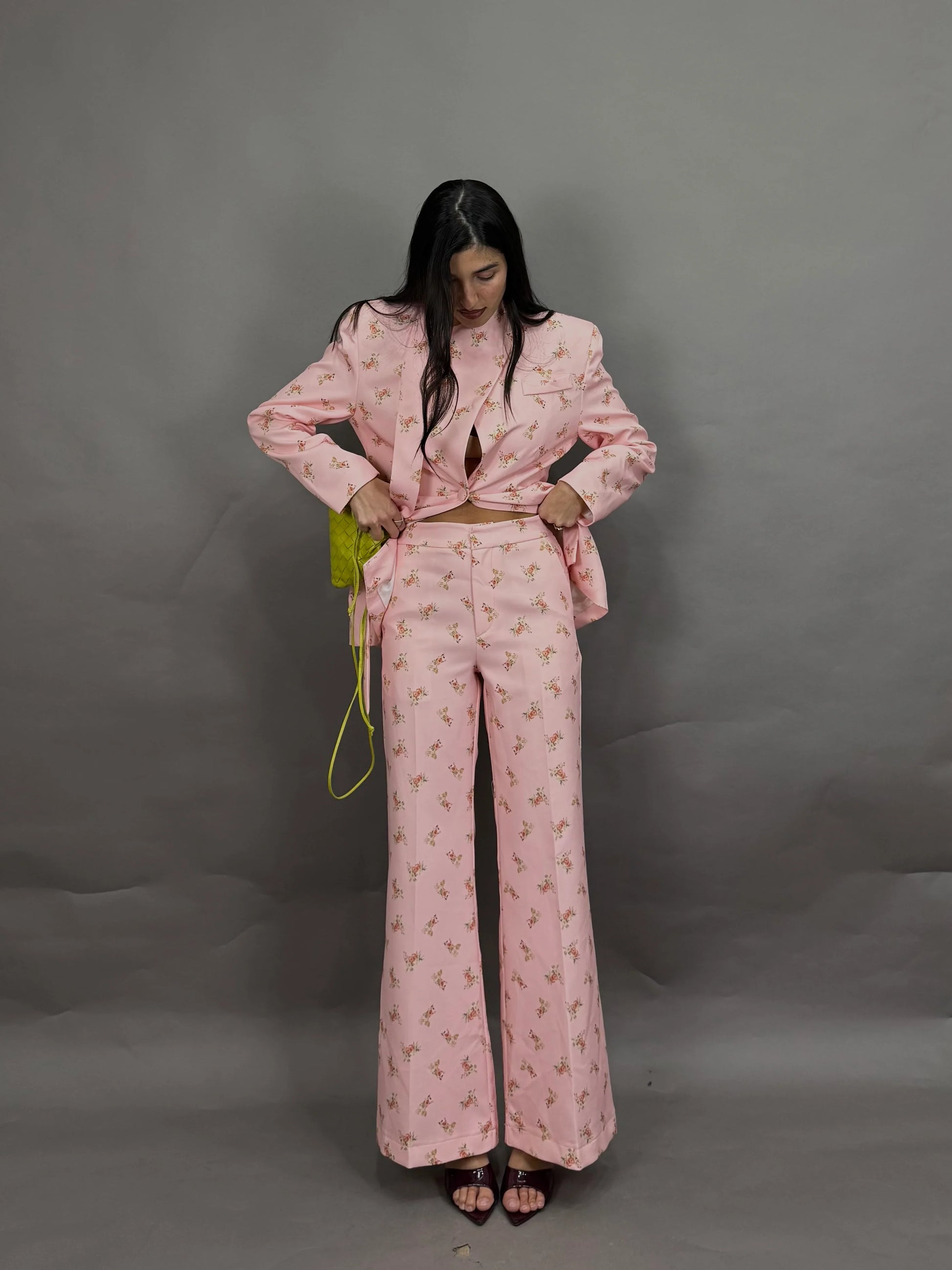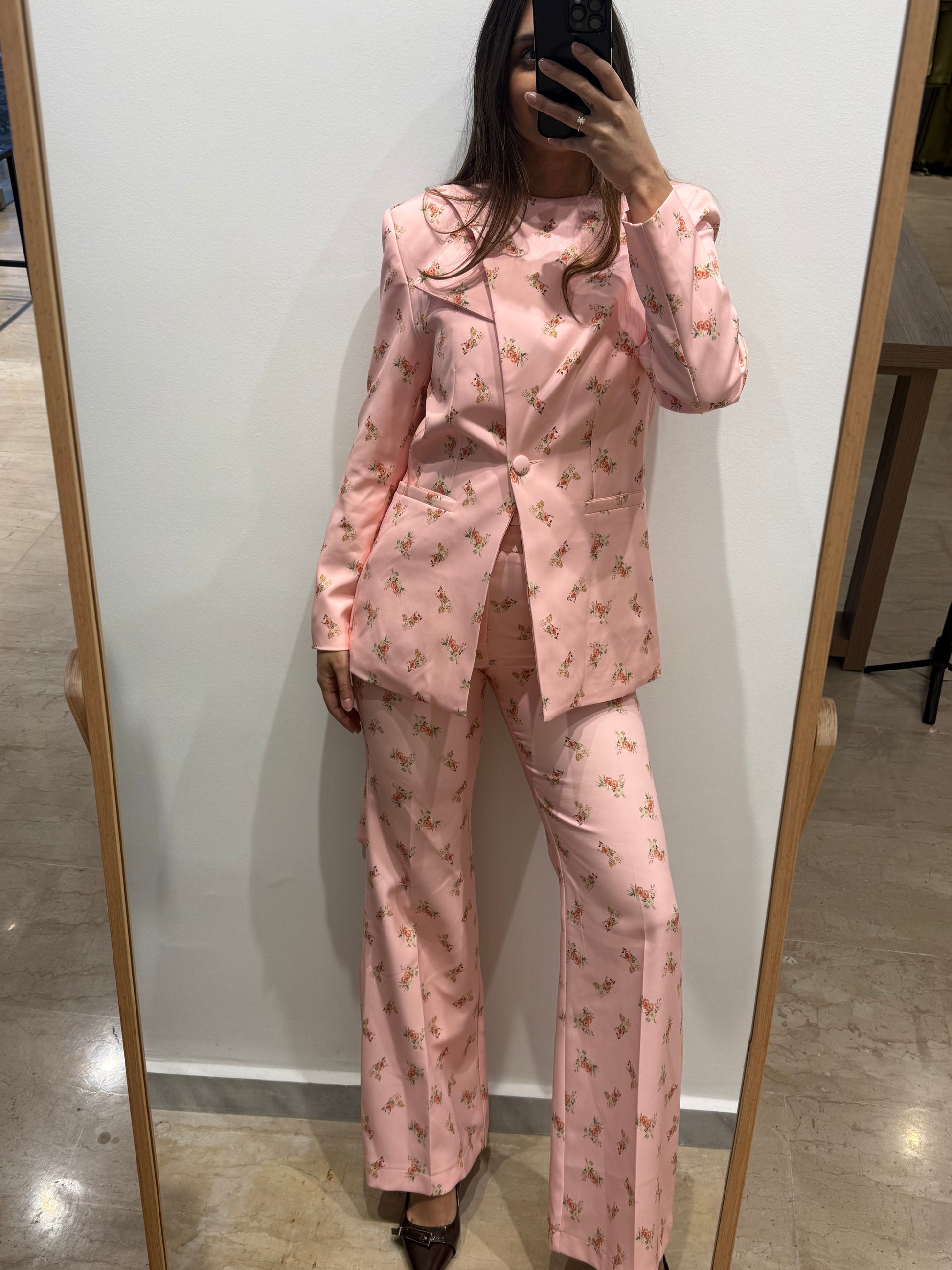 Ένα tailored σετ που ισορροπεί ανάμεσα στο ρομαντικό floral και τη δυναμική, δομημένη σιλουέτα.