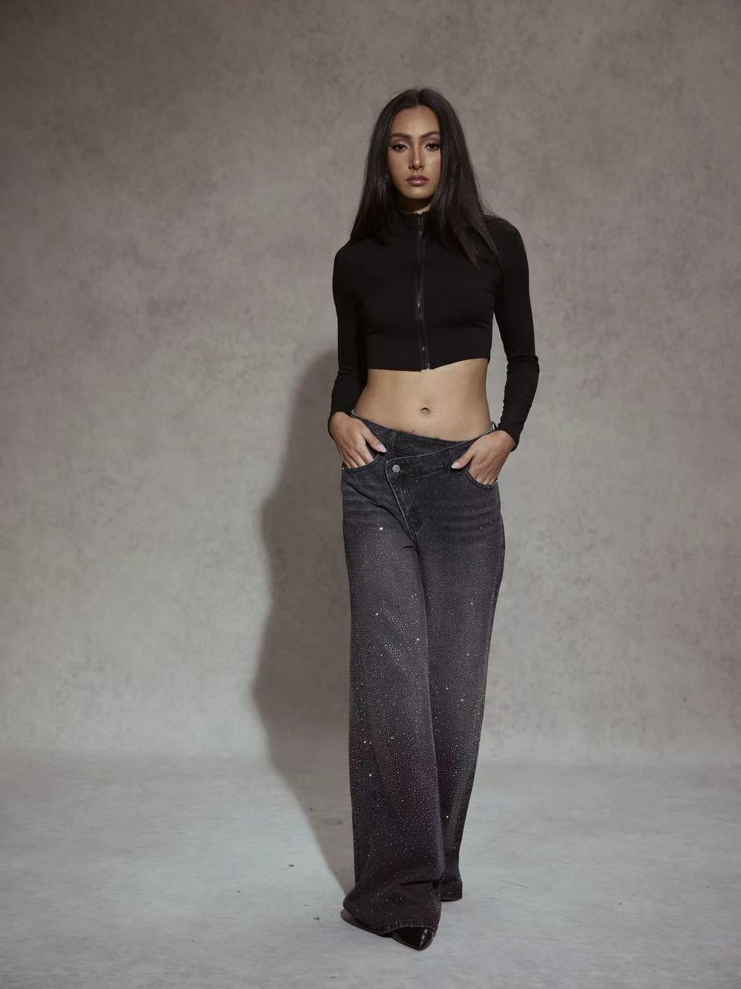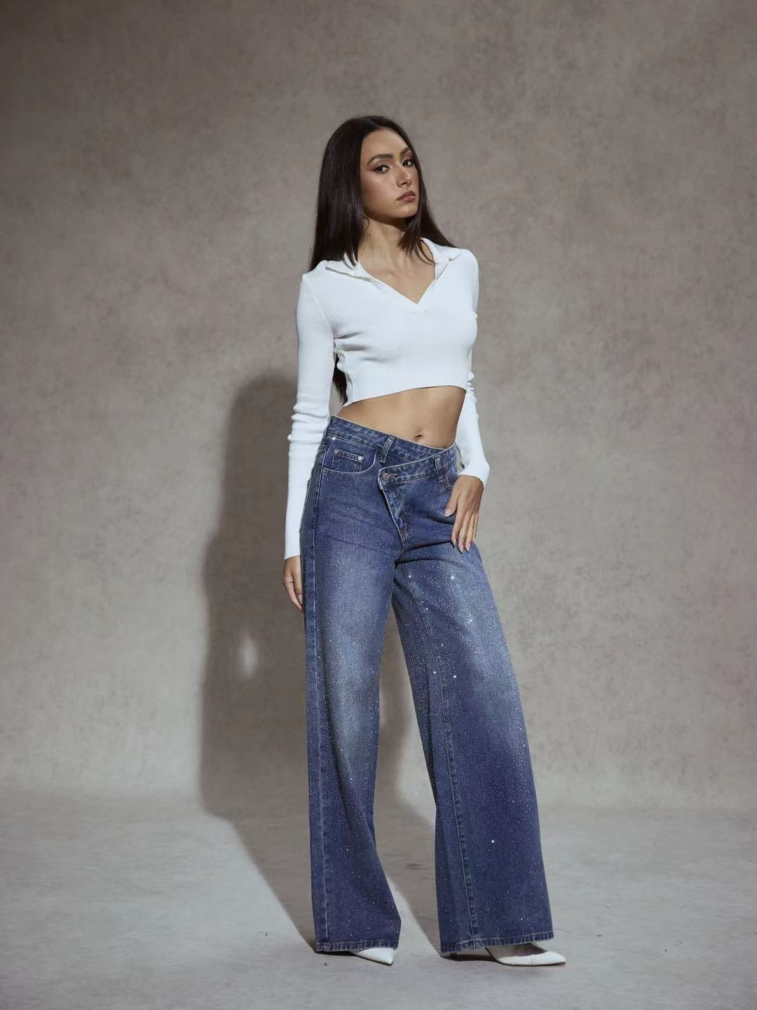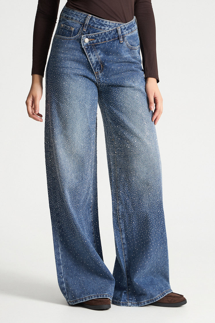 Τζιν παντελόνι με ασύμμετρο κουμπωμα και στρας