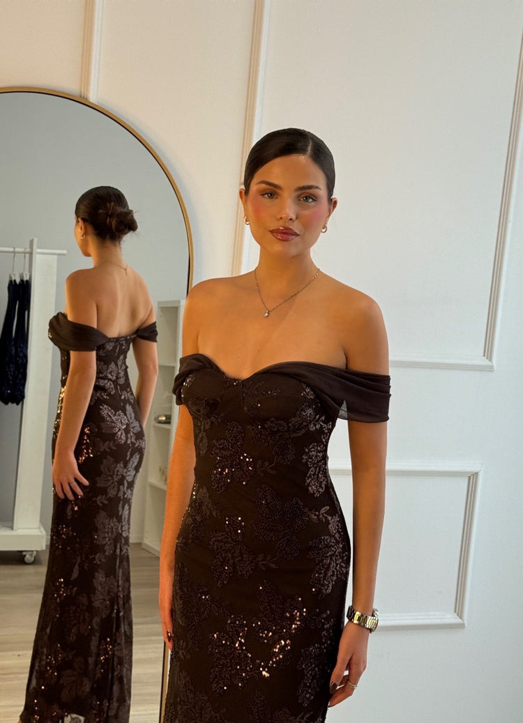 Φόρεμα με έξω ώμους και κεντητές λεπτομέρειες