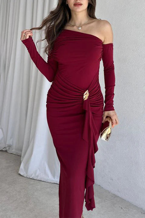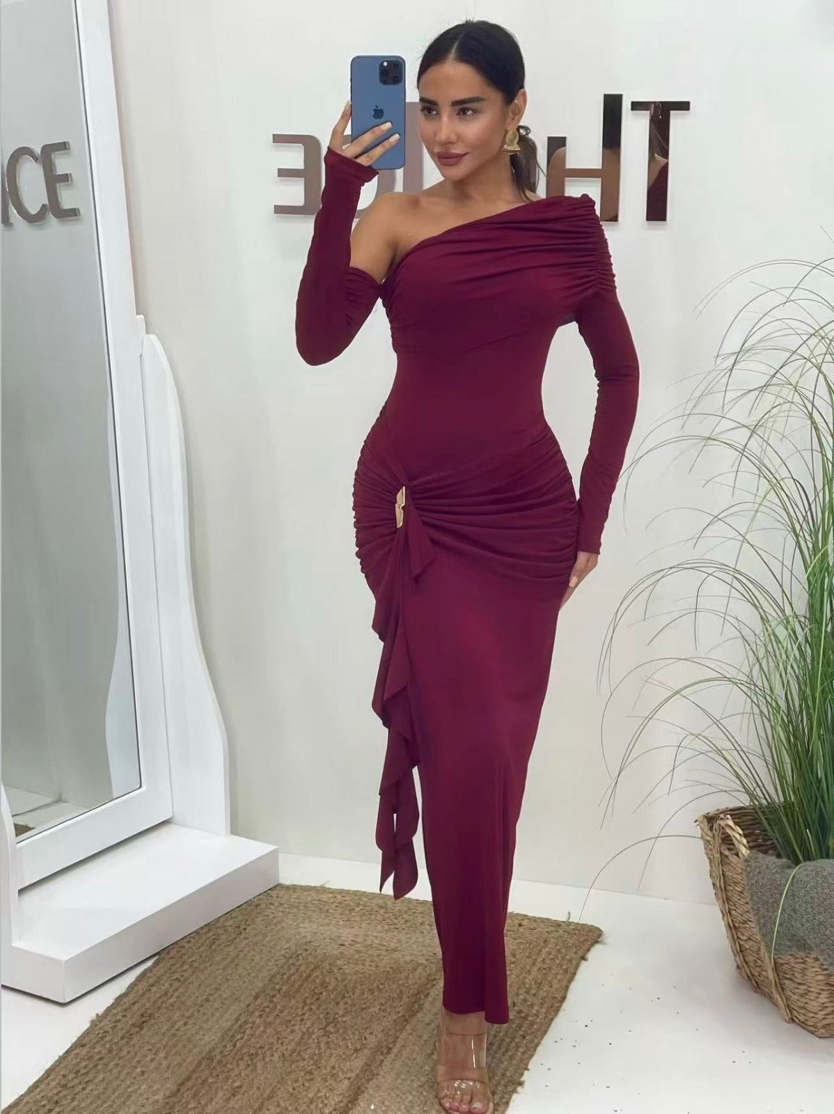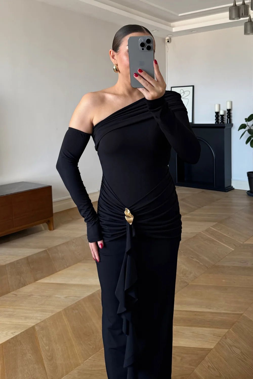 Φόρεμα με εξω ώμους και χρυσή λεπτομέρεια