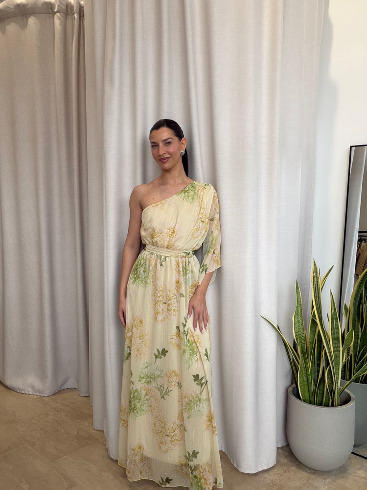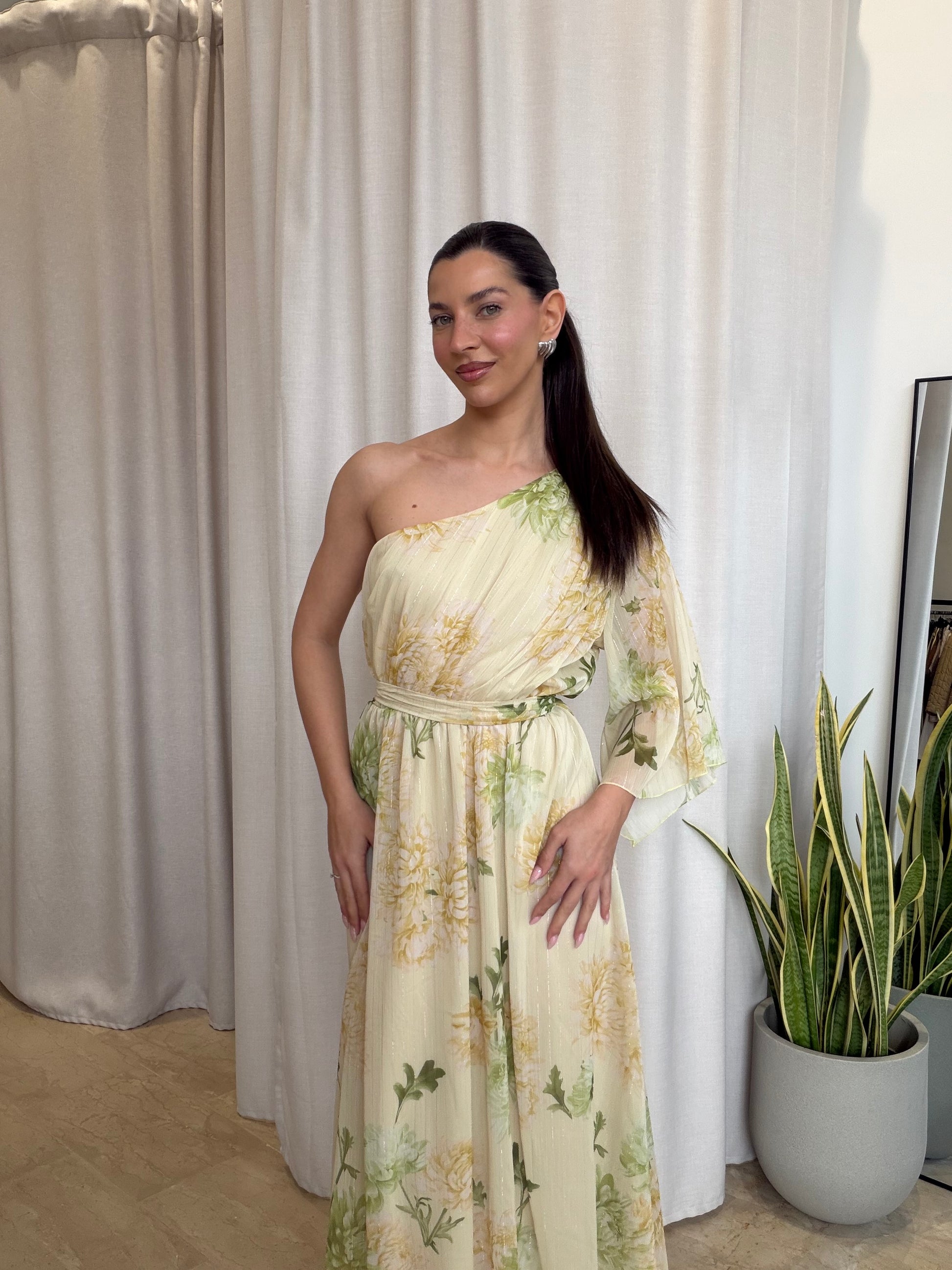 Αέρινο και εντυπωσιακό maxi φόρεμα με ρομαντικό floral σχέδιο, ιδανικό για ξεχωριστές εμφανίσεις 🌸 Το one shoulder σχέδιο με το ανάλαφρο μανίκι χαρίζει κομψότητα και θηλυκότητα, ενώ η ζώνη στη μέση τονίζει όμορφα τη σιλουέτα.